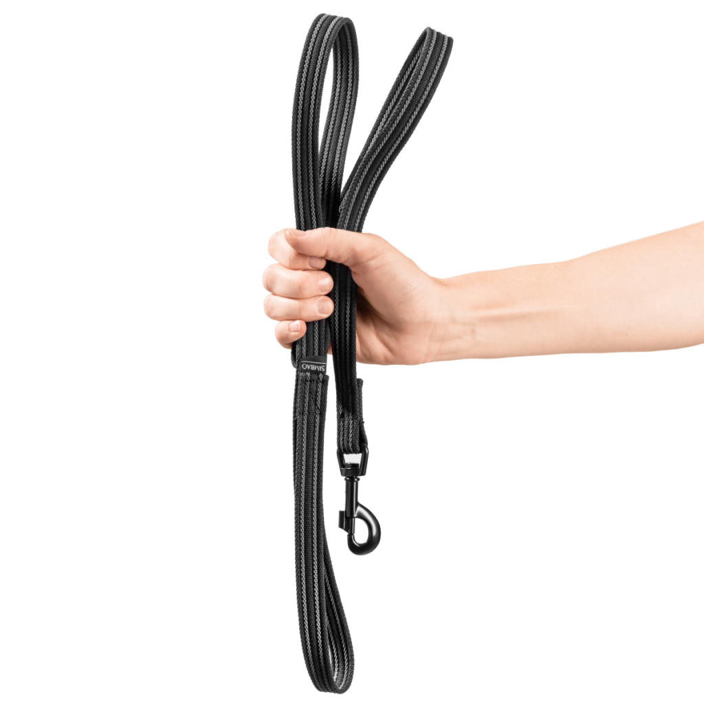 • Komfortowy chwyt – gumowane elementy zwiększają przyczepność, co pozwala pewnie trzymać smycz, nawet w trudnych warunkach.