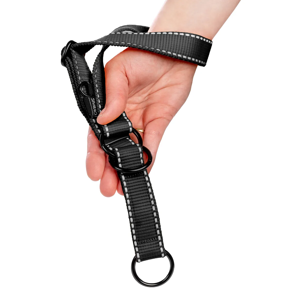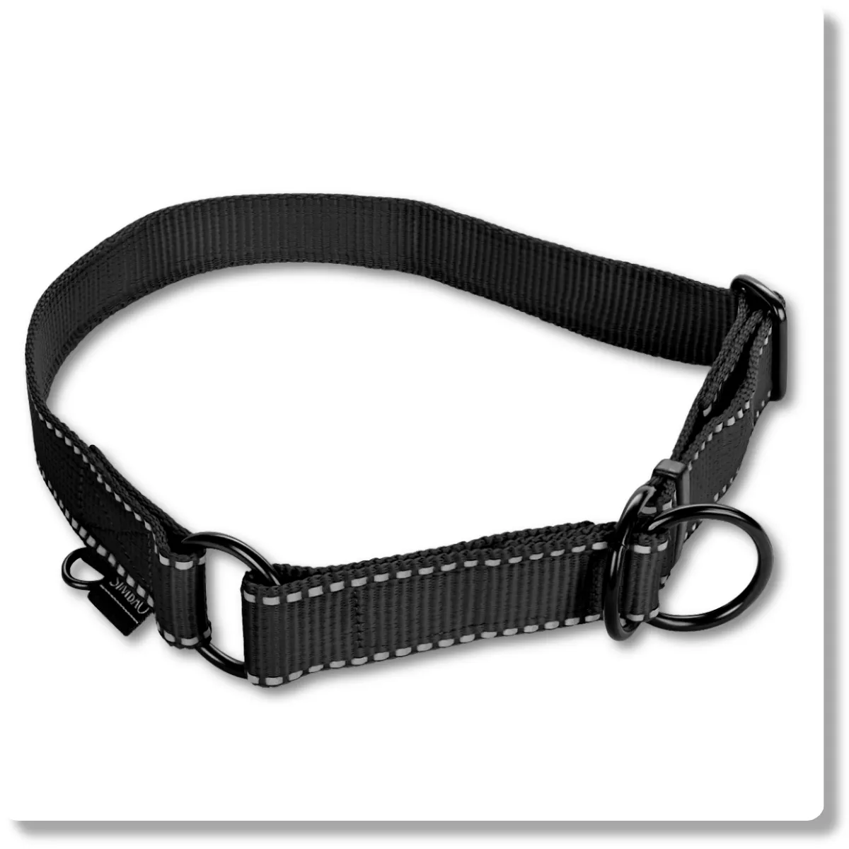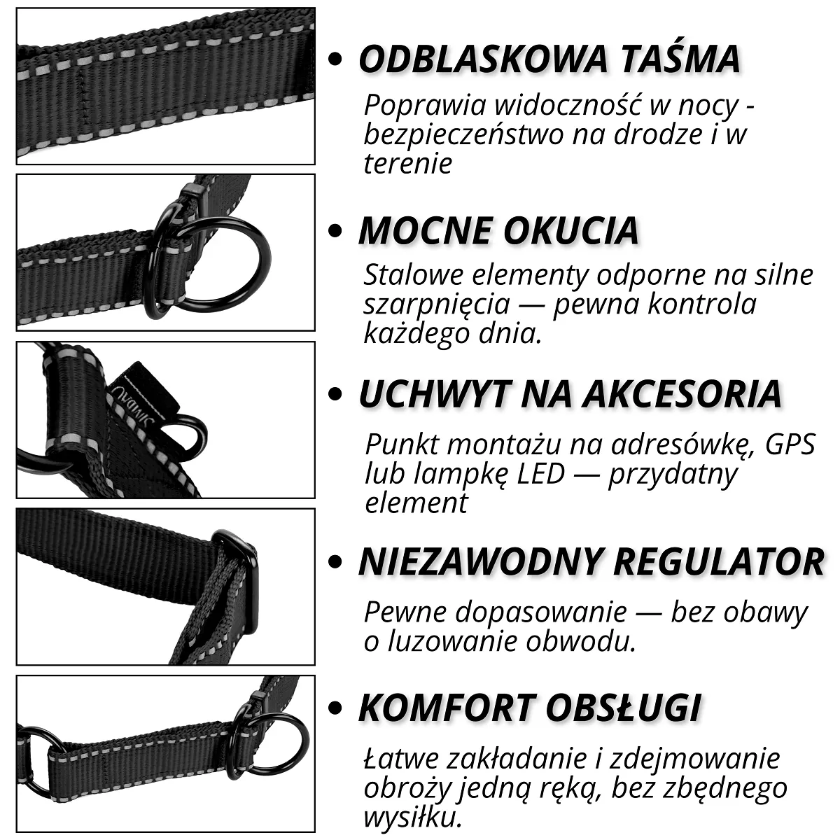 Regulowana odblaskowa obroża półzaciskowa martingale dla psów ras średnich i dużych. Zakładanie jedną ręką, taśma odblaskowa dla zwiększenia widoczności po zmroku, solidne okucia.