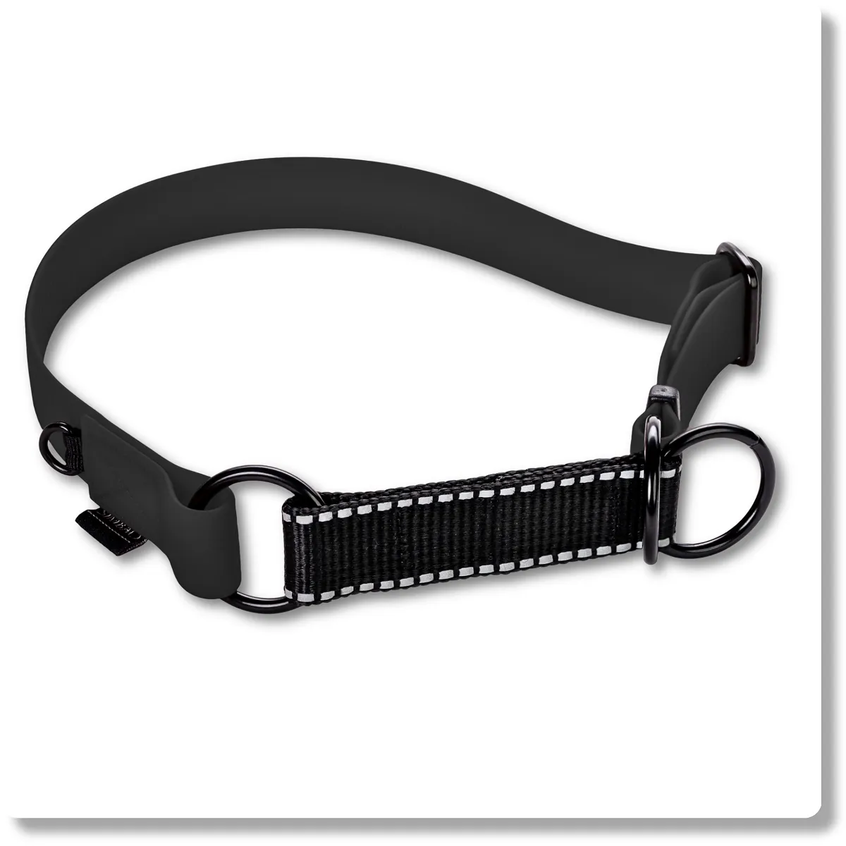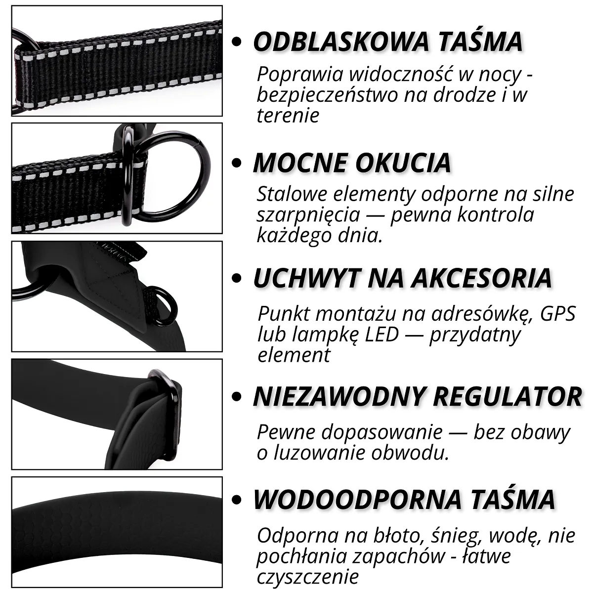 Regulowana wodoodporna obroża półzaciskowa martingale dla psów ras średnich i dużych. Nie nasiąka wodą, łatwa w czyszczeniu, zakładanie jedną ręką, elementy odblaskowe dla zwiększenia widoczności po zmroku, solidne okucia.
