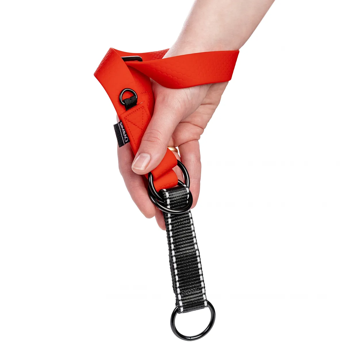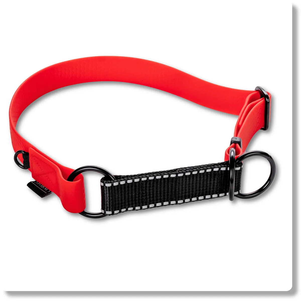 Regulowana wodoodporna obroża półzaciskowa martingale dla psów ras średnich i dużych. Nie nasiąka wodą, łatwa w czyszczeniu, zakładanie jedną ręką, elementy odblaskowe dla zwiększenia widoczności po zmroku, solidne okucia.