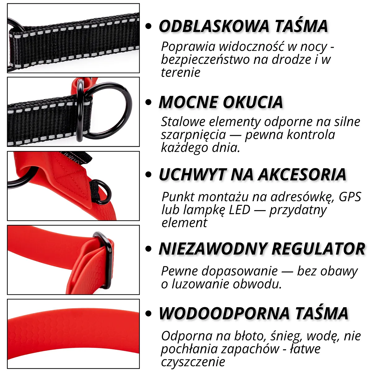 Obroża wykonana jest ze specjalistycznej taśmy wodoodpornej (grubość 2,5 mm, szerokość 25 mm), dzięki czemu: