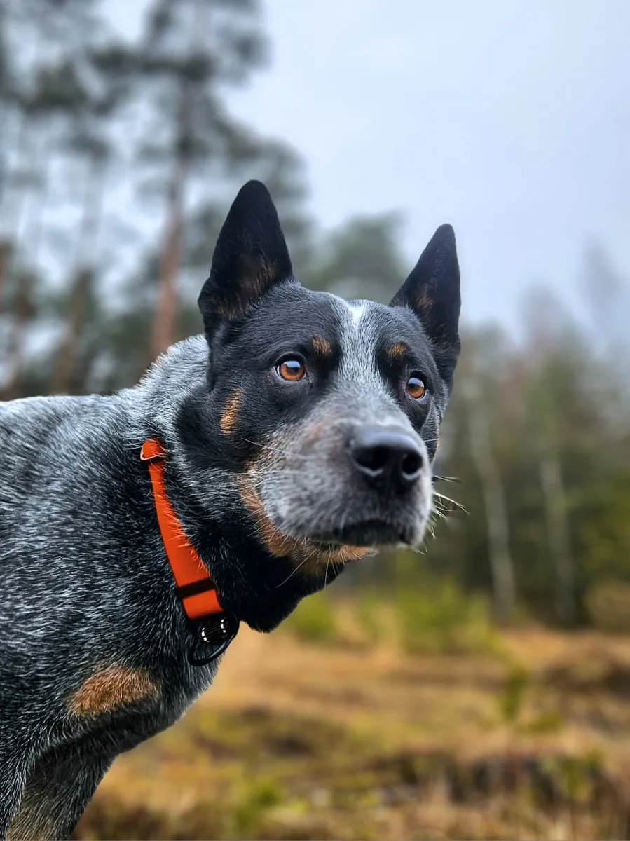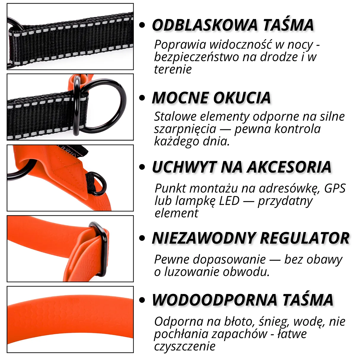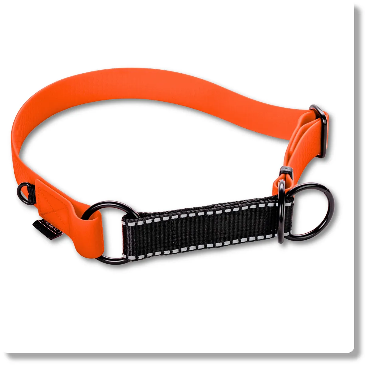 Regulowana wodoodporna obroża półzaciskowa martingale dla psów ras średnich i dużych. Nie nasiąka wodą, łatwa w czyszczeniu, zakładanie jedną ręką, elementy odblaskowe dla zwiększenia widoczności po zmroku, solidne okucia.